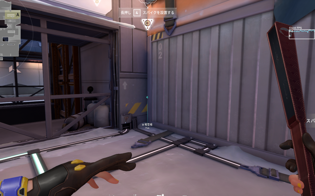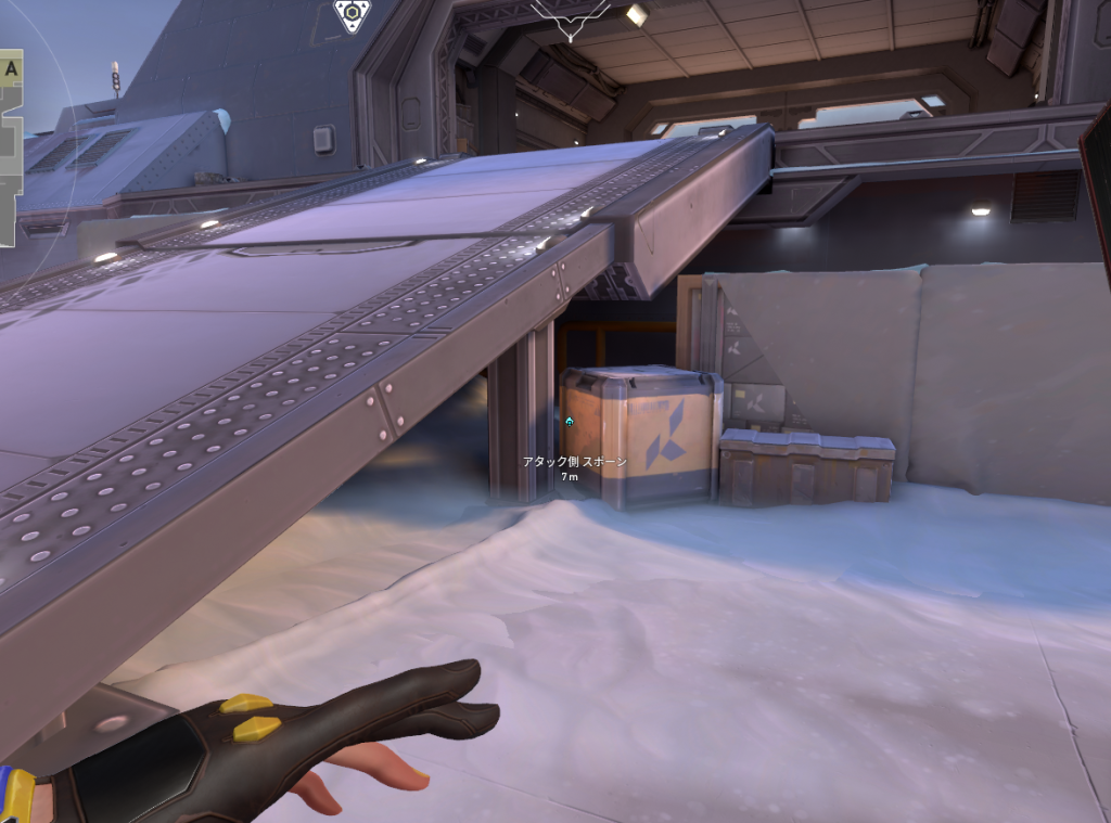 ディフェンダーでの定点はこれだけでも覚えておきましょう。B設置された後は敵の位置としてはイエロー裏とメインのみなのでその一つの選択肢をグレでつぶせることによるアドバンテージはとても大きいです。